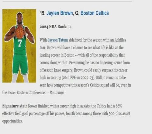 杰倫-布朗一直受到一定程度的低估,他在超頂薪續(xù)約時、獲得總決賽MVP時都有許多反對質(zhì)疑聲音,而且凱爾特人管理層也確實曾認真考慮過關(guān)于杰倫-布朗的交易方案,在賽季初ESPM評選的2025-26NBA百大球星中,布朗僅位列第19位,網(wǎng)站評語如下:由于塔圖姆跟腱撕裂賽季報銷,布朗將體驗波士頓凱爾特人隊頭號得分手的生活—以及隨之而來的所有責任,假設(shè)他沒有受到休賽期膝蓋手術(shù)的后續(xù)影響,那他很有可能超越職業(yè)生涯最高的場均得分(2022-23賽季26.6分),不過即便身處實力相對較弱的東部聯(lián)盟,以目前凱爾特人隊的競爭力究竟有何表現(xiàn)仍有待觀察.